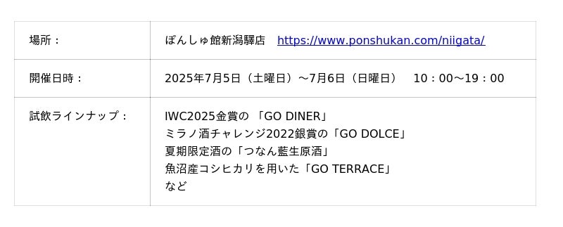 津南醸造株式会社(本社:新潟県中魚沼郡津南町、代表取締役:鈴木健吾、以下「津南醸造」)は、2025年7月5日(土)・6日(日)の2日間、ぽんしゅ館新潟驛店にて日本酒試飲イベントを開催いたしました。