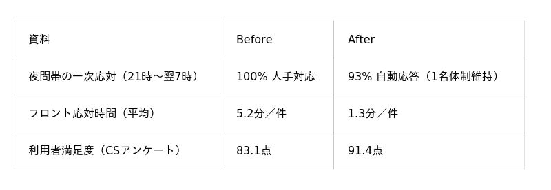 「"電話の取りこぼし"が減り、深夜スタッフの心理的負担も軽減されました。音声が自然で"AIと気づかれなかった"という声も多数ありました。」