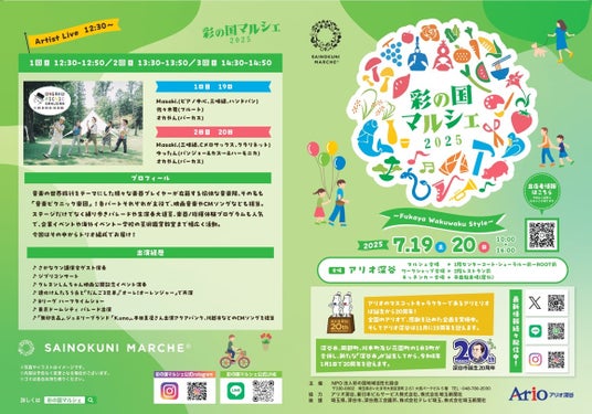 NPO法人 彩の国地域活性化協会(拠点:埼玉県さいたま市、代表理事:佐々木 輝伸)が主催する「彩の国マルシェ」は、2025年7月19日と20日の2日間、埼玉県深谷市にあるアリオ深谷にて「彩の国マルシェ~Fukaya Wakuwaku Style~」を開催いたします。