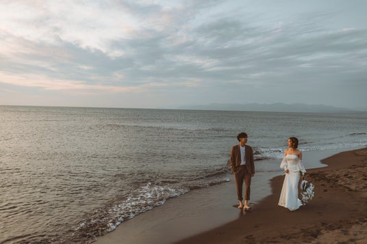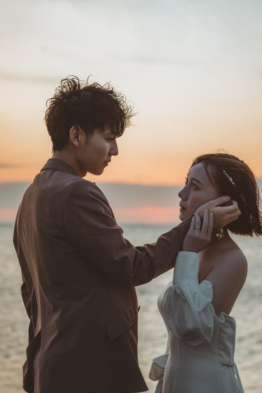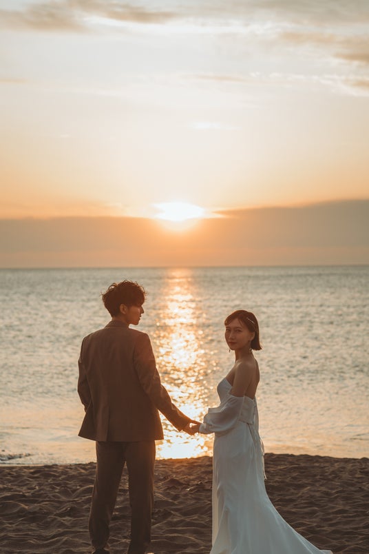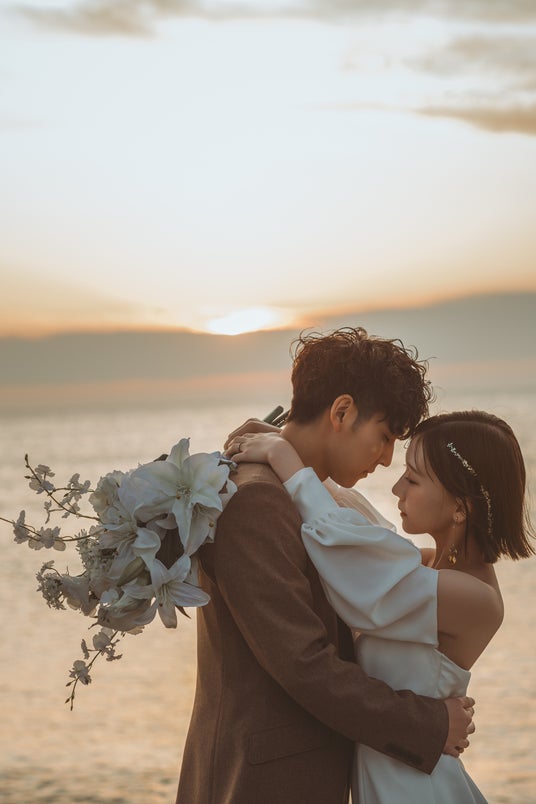 洗練されたシルエットが、夕焼けに煌めく水面と砂浜に映え、ただそこに佇むだけで絵になる特別な瞬間を演出。自然体の笑顔、そっと触れ合う指先、見つめ合う瞳…一つ一つの仕草が、お二人の揺るぎない愛と未来への希望を雄弁に物語ります。