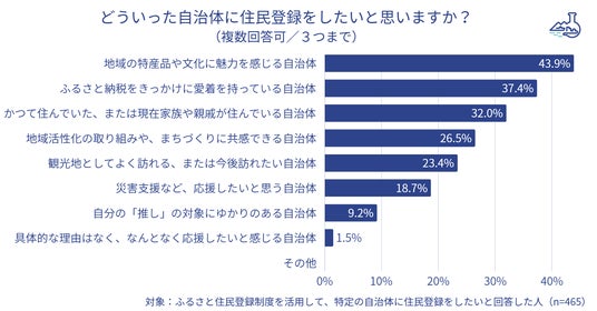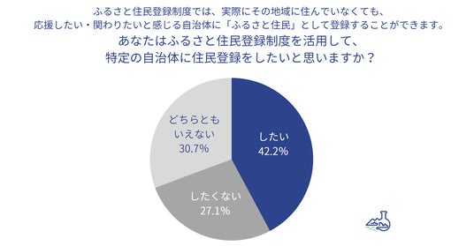 「ふるさと住民登録制度を活用して、特定の自治体に住民登録をしたい」と回答した人は、全体の42.2%にのぼりました。登録したい自治体としては、「地域の特産品や文化に魅力を感じる自治体」(43.9%)が最も多く、次いで「ふるさと納税をきっかけに愛着を持っている自治体」(37.4%)が挙がりました。ふるさと納税制度が、地域への愛着形成や継続的な関係づくりに寄与している傾向が見受けられます。