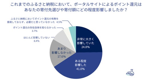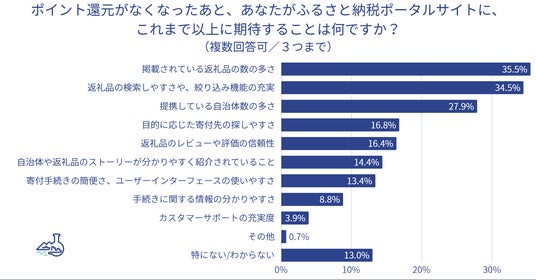 これまでの寄付行動においては、ポイント還元が「寄付先選びや寄付金額に影響した」と答えた人が全体の65.8%。10月以降のポータルサイト選びにおいては、「返礼品の掲載数」(35.5%)、「検索のしやすさ」(34.5%)、「掲載自治体数」(27.9%)などへの期待が高く、ルール変更を契機に「ポータルサイトの独自価値」がより重視される傾向が見て取れます。