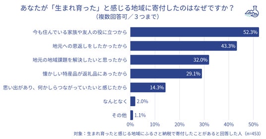 寄付先として「生まれ育った地域」を選んだことがある人は全体の41.1%にのぼりました。その理由としては、「今も住んでいる家族や友人の役に立つから」(52.3%)や「恩返しをしたいから」(43.3%)といった、個人的なつながりや感謝の気持ちに基づいた動機が上位を占めています。