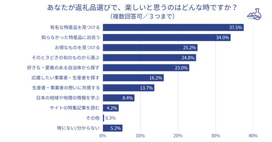 また、返礼品を選ぶ際に「事業者や生産者の想いやストーリーに共感できると寄付したくなる」と答えた人は56.8%にのぼり、モノの魅力だけでなく、その背景にある「人」や「地域の取り組み」への関心も高まっていることがわかります。返礼品選びで「楽しい」と感じる瞬間としては、「有名な特産品に出会えたとき」(37.5%)が最も多く、そのほか「好きな自治体から探す」(23.0%)や「応援したい事業者・生産者を探す」(15.4%)といった回答もあり、寄付先に対する思いや関係性を大切にしながら返礼品を選ぶ人も一定数いることがうかがえます。