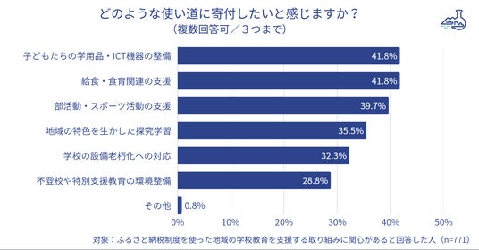ふるさと納税の使い道として関心が高いテーマは、「農林漁・水産・商工」(29.7%)、「教育・子育て」(27.7%)、「震災復興」(27.4%)の順となり、地域の基盤を支える一次産業や教育分野への関心が高い傾向が見られます。特に、学校教育を支援する取り組みに関心があると答えた人は全体の約7割(69.9%)にのぼり、希望する寄付の使い道としては、「子どもたちの学用品・ICT機器の整備」と「給食・食育関連の支援」がいずれも最多となりました。続いて「部活動・スポーツ活動の支援」も高い関心を集めており、教育現場の多様な課題に対する関心の高さがうかがえます。