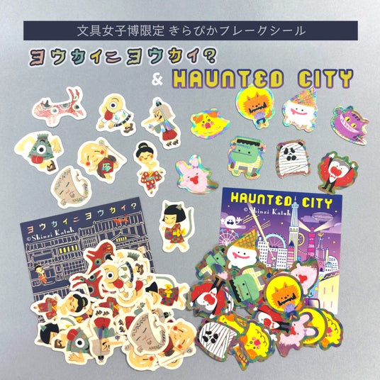 レインボー箔がきらりと光る、ポップで不思議なフレークシール!キュートでどこか怪しい個性派妖怪たちをカラフルなカラー&幻想的な箔押しで表現しました。彼らが現れる背景の町並みシールも封入!