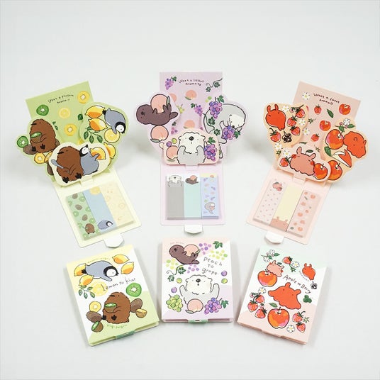 パッケージを開けると爽やかなフルーツと人気の海のいきものたちが飛び出すしかけの付箋!