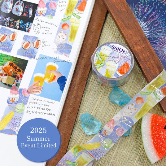 夏の爽やかな風物詩をぎゅっと詰め込んだマスキングテープ。金箔押しでスイカや花火、かき氷の涼やかなモチーフがキラッときらめきます♪大きなイラストを楽しめる縦向きデザインも魅力的!