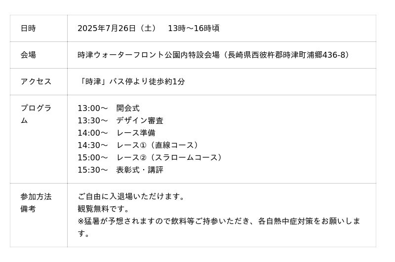 長崎県内の高等学校4校(島原工業、長崎鶴洋、長崎工業、長崎総合科学大学付属)の生徒が、ポンプや電動ドリル、扇風機の身近な機器でエンジンを製造しオリジナルの船を製作。大村湾で船のスピードや操作性を競います。また、「アイディア賞」「技術賞」「環境によいで賞」「デザイン賞」「おもしろ賞」の5部門でコンテストも実施。各校の生徒たちが思考を凝らした船が、受賞を目指し大村湾で競い合います!観覧無料です。高校生たちの熱い戦いを、会場で一緒に応援しませんか?