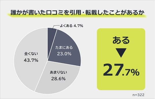 ブログやSNSで情報発信している322人に、「誰かが書いた口コミを引用・転載したことがあるか」と聞いたところ、「よくある(4.7%)」「たまにある(23.0%)」が合わせて27.7%でした。誰かが書いた口コミを引用・転載したことがある人は少数派だとわかります。