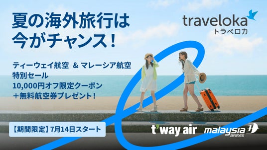 航空券、ホテル、アクティビティ、空港送迎、レンタカーなどの予約をワンストップで提供する旅行予約プラットフォーム「トラベロカ(Traveloka)」(日本法人本社:東京都港区、代表取締役:クリスチャン・ヌグロホ)は、好評のうちに幕を閉じた「トクしちゃおっか!夏旅セール」に続き、海外旅行で人気のティーウェイ航空・マレーシア航空と連携した期間限定のスペシャルキャンペーンを7月14日(月)より開催いたします。