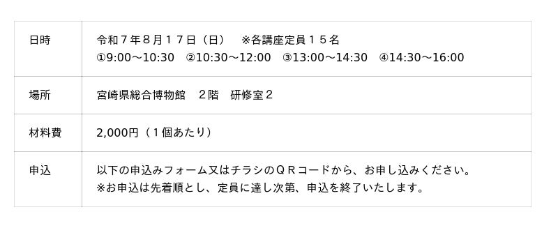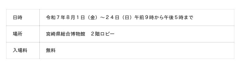 宮崎県は、県の伝統的工芸品を多くの人に知ってもらい、興味を持ってもらうことを目的として、夏休み期間を利用して宮崎県総合博物館において伝統的工芸品の展示を実施します。