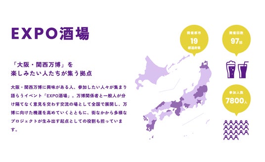 大阪・関西万博に興味がある人、参加したい人々が集まり語らうイベント「EXPO酒場」。万博関係者と一般人が分け隔てなく意見を交わす交流の場として全国で展開し、万博への機運を高めていくとともに、街なかから多様なプロジェクトが生み出す起点としての役割も担ってきました。これまで全国19都府県で開催され、参加者は延べ7,800人以上にのぼります。