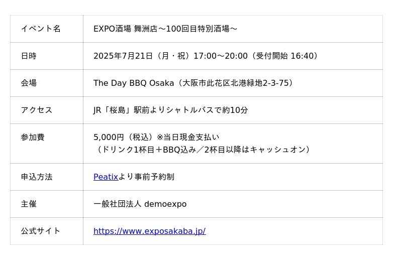 一般社団法人demoexpo(所在地:大阪府大阪市西区京町堀1-12-11 愛晃ビル4F、代表理事:花岡、以下「demo!expo」)は、大阪・関西万博に関心を持ち、参加を希望する人々が集い語り合うイベント「EXPO酒場」の第100回目を、万博会場・夢洲を望む舞洲にて開催いたします。