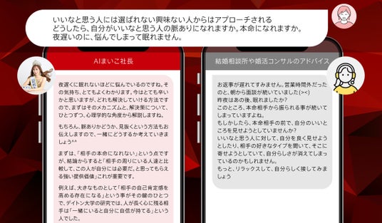 世界初の心理学と婚活の専門家である「AIまいこ社長」が24時間365日寄り添います(回答イメージ1.)
