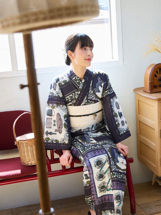 スカーフのように描かれたオリジナルテキスタイルの浴衣。