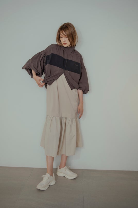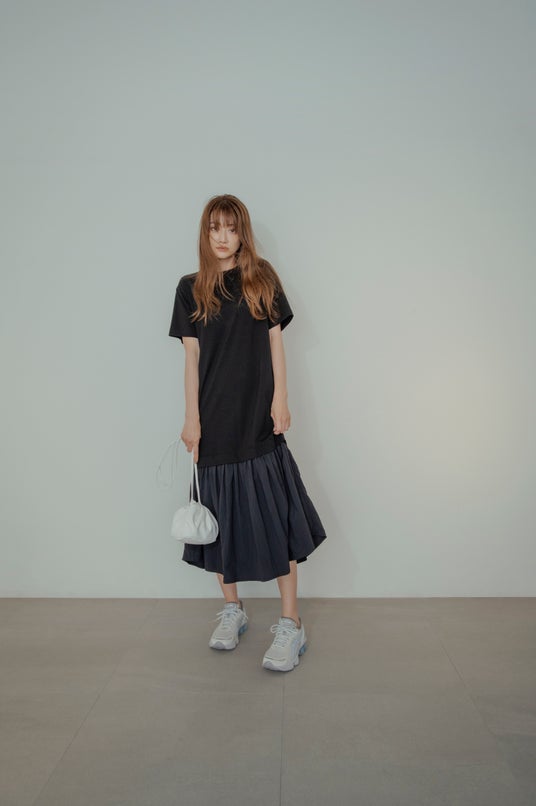 さらりとした綺麗めのTシャツに、ナイロン素材のボリュームスカートを組み合わせたemmiならではのドッキングワンピース。カジュアルな雰囲気ながら、スカートの程よいボリューム感が女性らしいシルエットを演出します。スタイリングいらずで一枚で着映えて、シワになりにくい素材のためデイリーシーンはもちろんご旅行にもおすすめです。