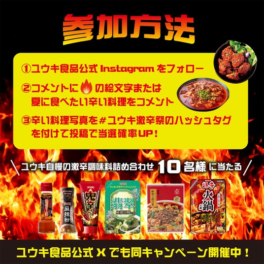 世界各国の調味料や食材を幅広く取り扱うユウキ食品株式会社(本社:東京都調布市富士見町1-2-2、代表取締役社長:田中秀和)は、公式InstagramおよびX(旧Twitter)にて、夏にぴったりの激辛調味料が当たる「激辛祭」プレゼントキャンペーンを実施いたします。