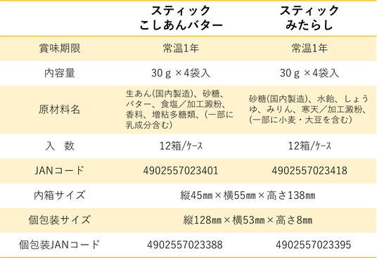 ■スティックタイプ(こしあんバター、みたらし)こしあんバターとみたらしの2フレーバーご用意いたしました。