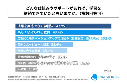 調査の最後、「どんな仕組みやサポートがあれば、学習を継続できていたと思うか」を尋ねる設問への回答では、1位が「成果を実感できる学習法」で47.9%、2位が「楽しく続けられる教材」で43.4%、3位が「定期的なモチベーションアップの仕組み(目標設定、振り返り)」で36.5%という結果になりました。4位、5位も回答率25%を超える形となり、この結果から、英会話学習を始めたものの途中で辞めた経験のある人が、これがあれば学習を継続できていたと思うものは様々あることが明らかになりました。