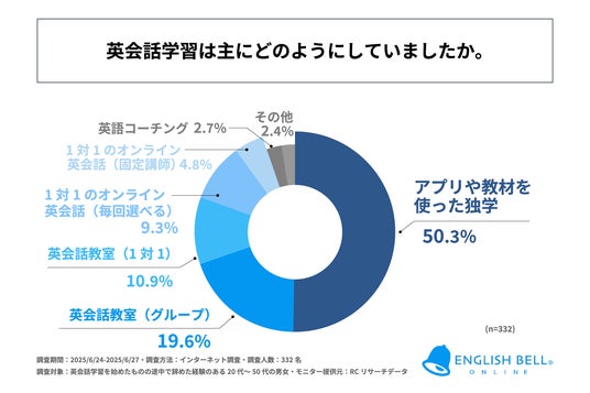 次に、「英会話学習の主な方法」を尋ねる設問への回答では、1位が「アプリや教材を使った独学」で50.3%、2位が「英会話教室(グループ)」で19.6%、3位が「英会話教室(1対1)」で10.9%という結果になりました。この結果から、英会話学習を始めたものの途中で辞めた経験のある人が行っていた英会話学習の方法として最も多いのは、「アプリや教材を使った独学」であることがわかりました。