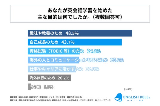 まず、「英会話学習を始めた主な目的」を尋ねる設問への回答では、1位が「趣味や教養のため」で48.5%、2位が「自己成長のため」で43.7%、3位が「資格試験(TOEIC等)のため」で24.1%という結果になりました。この結果から、英会話学習を始めたものの途中で辞めた経験のある人が英会話学習を始めた主な目的は、「趣味や教養のため」や「自己成長のため」であることが明らかになりました。