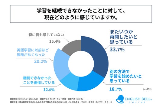 今回の調査により、英会話学習を始めたものの途中で辞めた経験のある人が英会話学習を始めた主な目的は、「趣味や教養のため」や「自己成長のため」であり、英会話学習の方法として最も多いのは、「アプリや教材を使った独学」であることが明らかになりました。また、英会話学習を始めたものの途中で辞めた経験のある人の6割以上が「1年未満」で英会話学習を辞めており、英会話学習を辞めた理由のトップ3は、1位「モチベーションが下がったから」、2位「忙しくて時間が取れなくなったから」、3位「成果を感じられなかったから」であることがわかりました。尚、英会話学習を始めたものの途中で辞めた経験のある人の半数以上が、学習を継続できなかったことに対して「何らかの方法で学習を再開したい」と考えており、これがあれば学習を継続できていたと思うものトップ3は、1位「成果を実感できる学習法」、2位「楽しく続けられる教材」、3位「定期的なモチベーションアップの仕組み」であることがわかりました。