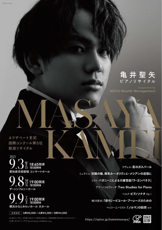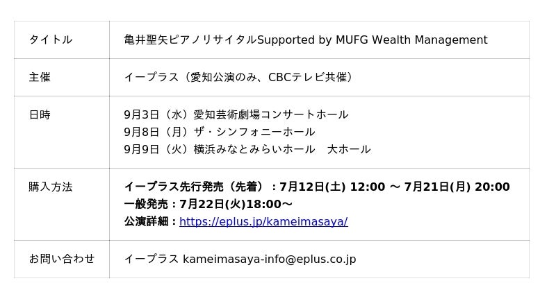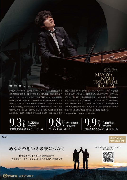 株式会社三菱UFJフィンシャル・グループ(以下、MUFG)の連結子会社である株式会社三菱UFJ銀行は、MUFGのサービスブランド「MUFGウェルスマネジメント」として、本年9月に国内3か所で実施されるピアニスト亀井聖矢さんのピアノリサイタルへ協賛をいたします。亀井さんの音楽は聴く人の心に深く響き、世代や国境を越えて"想い"をつなぐ力があり、MUFGウェルスマネジメントのブランドプロミス「あなたの想いを未来につなぐ」ともつながることから、本協賛を決定しました。