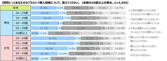 当社が2025年1月~2月に実施したインターネットアンケート調査では、20代・30代女性の2人に1人以上が、大人になってからカプセルトイを購入したことがある、ということが明らかになりました。さらに、すべての年代で男性よりも女性の方が大人になってからカプセルトイを購入している人の割合が高いことが明らかになりました。