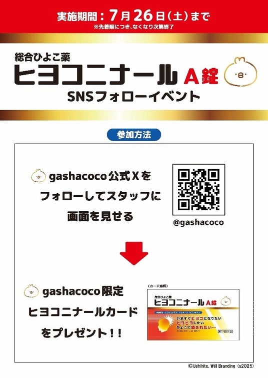 gashacoco公式Xをフォローし、フォロー画面をスタッフに提示いただくと「限定ヒヨコニナールカード」をプレゼント