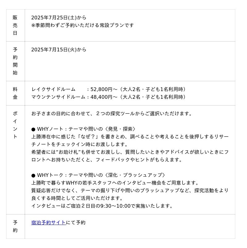 小学生から高校生までのお子様をお連れのご家族を対象にしており、ホテル滞在を通じたゼロ・ウェイスト体験のインプットとアウトプットを促進する学習ツール「WHYノート」、もしくはスタッフへのインタビュー機会「WHYトーク」を用意します。子供たちの観察力・言語化力・表現力・対話力を刺激し、夏休みの自由研究や探究活動にぴったりのプランとなっております。
