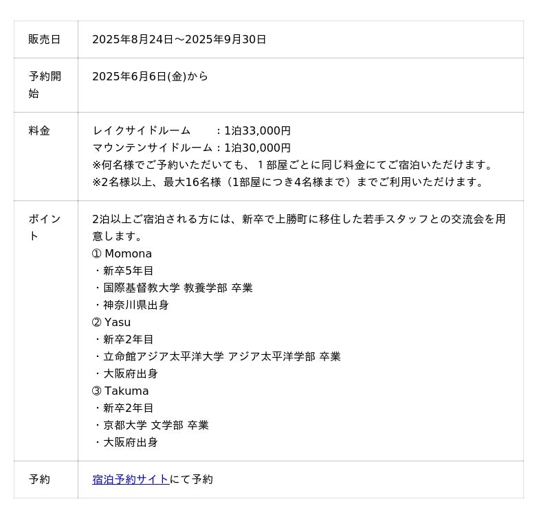 主に地方創生や循環型社会、環境型建築デザインに興味を持っている大学生を対象にしており、対象期間に一律の宿泊料金でご宿泊いただけるお得なプランとなっております。また、連泊するお客様については、就職を機に上勝町に移住した若手スタッフへのインタビュー機会を提供します。