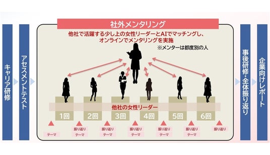 メンターは、現役で正社員として他社で働いている女性リーダー達であり、プロメンターやキャリアコンサルタントとは異なる「女性リーダーのリアルなキャリアストーリー」を多く聞くことができます。さまざまな経験・バックグラウンドをもつ現役女性リーダーであるメンターとの6回の対話を通じて、女性社員自身が自らのキャリアにおける軸を見つけることを支援します。