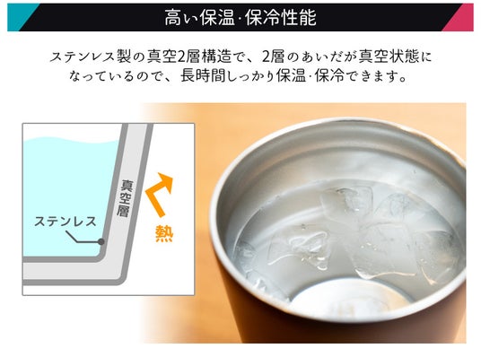真空二層構造のため、氷が溶けにくく、ホットドリンクも長時間しっかり温かさをキープできます。