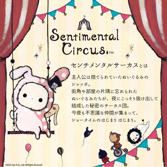 センチメンタルサーカスは、捨てられていたぬいぐるみの「シャッポ」と、街角や部屋の片隅に忘れられたぬいぐるみたちが、夜にこっそり抜け出して結成した秘密のサーカス団。可愛さの中にどこか哀愁を感じさせる仲間たちが、心にそっと寄り添って癒してくれます。