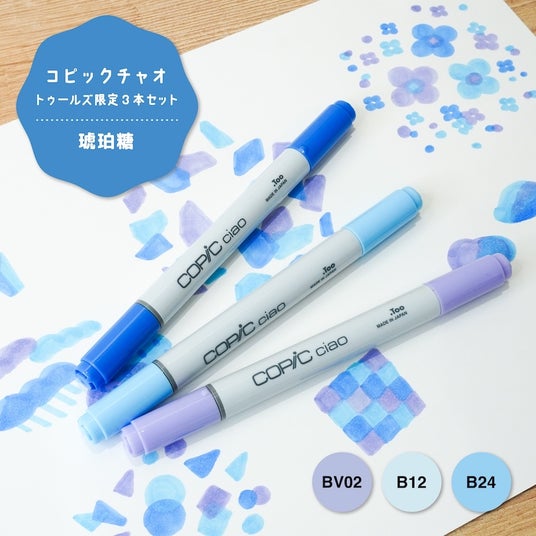 コピックチャオ トゥールズ限定3本セットは、「カプチーノ」「ソーダフロート」「キャンディ」「琥珀糖」「アイスクリーム」の5種類をラインナップ。