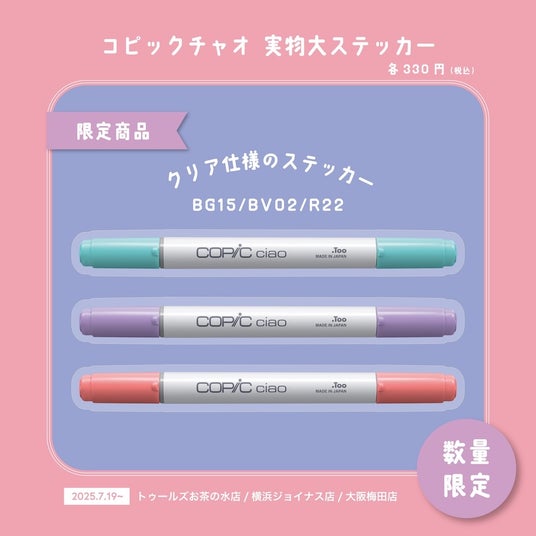 3店舗では、トゥールズ限定品となるスイーツ、ドリンクをモチーフとしたコピックチャオ トゥールズ限定3本セット(各税込924円)や、実際の製品サイズで作成したコピックチャオの実物大ステッカー(各税込330円)を販売します。