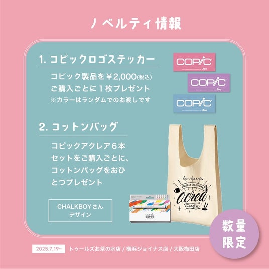 期間中、トゥールズでコピック製品を税込2,000円以上購入された方にキャンディーカラーのコピックロゴステッカー(全3色)と、コピックロゴ入りオリジナルショッパーを各1点プレゼントいたします(※ステッカーはご購入金額2,000円ごとに1枚プレゼントいたします)。