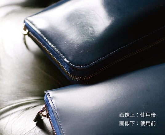 松阪レザーのなかに含まれる良質な油脂は、使い込むことで表面に浮き出され光沢を放ち、味わい深い艶が増してくるため、経年変化を楽しむことができます。