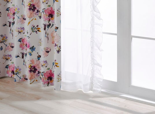 デザインレースカーテン両端のフリルが窓辺を大人かわいく演出します。