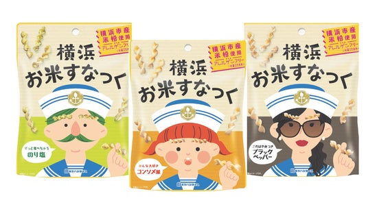 「横浜お米すなっく」は、横浜市産のお米を100%使用した、グルテンフリーのスナック菓子です。アレルゲン28品目不使用のため、子供から大人まで、家族みんなでお楽しみいただけます。 イメージキャラクターは"みなとまち横浜"をイメージした船長さんファミリー。ポップで可愛らしいパッケージが目を惹きます。