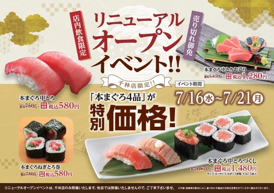 リニューアルオープンイベントとして、にぎり長次郎千林店限定で「本まぐろ4品」を特別価格にて販売!