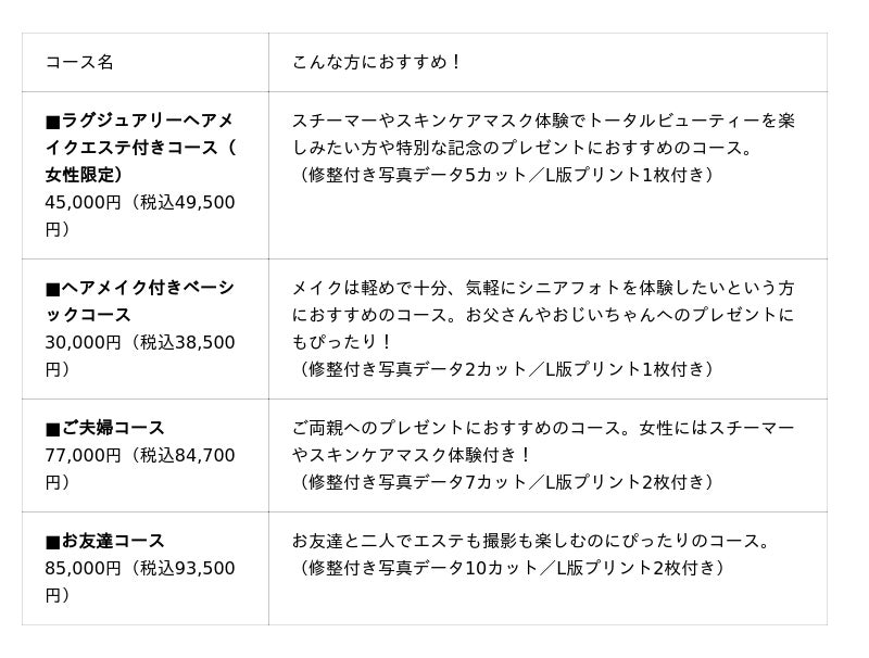 ご自身の魅力を引き出し、思い出に残る素敵な写真をデータ&フレームで残したい方、トータルビューティーも楽しんで特別な記念日として写真を残したい方、気軽に撮影を体験したい方など、それぞれのニーズに合わせた4つのコースをご用意しました。撮影にかかるお支度代と撮影データや写真集などの商品を含む料金体系となっており、お好みやご予算に合わせて最適なコースを選びやすくなっております。