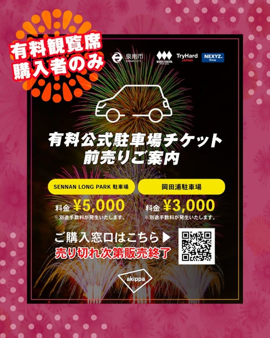 ■有料公式駐車場について2024年開催より周辺駐車場不足の解消や、近隣施設および住宅への違法駐車削減を目指して、akippa株式会社と連携し、公式駐車場を展開して参りました。先日の無料駐車場のご応募も大変ご好評をいただき、今年も有料公式駐車場の販売を決定いたしました。昨年完売しました岡田浦駐車場に加えて、今年はより会場から近い駐車場も展開いたします。