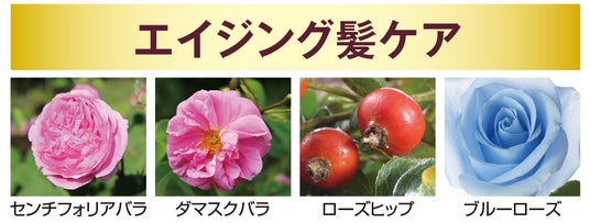 3種のバラ(センチフォリアバラ・ダマスクバラ・ローズヒップ)を植物性スクワランで抽出したエキスやブルーローズ配合(すべて保湿成分)。髪の保湿とダメージケアをしながら、エイジング髪ケア成分*⁹で髪にハリ・コシ・ツヤを与え、ふんわり指通りの良い髪に。シャンプーするたび、華やかに咲き誇るバラの香りが広がり、心まで満たされるような贅沢なヘアケア時間を演出します。