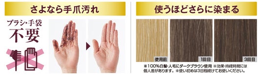 保湿しながら1度で深く染まる「ディープカラートリートメント プロ」、そして、外出前にポンポンして手軽に白髪を隠せる「はやわざヘアファンデーション」。