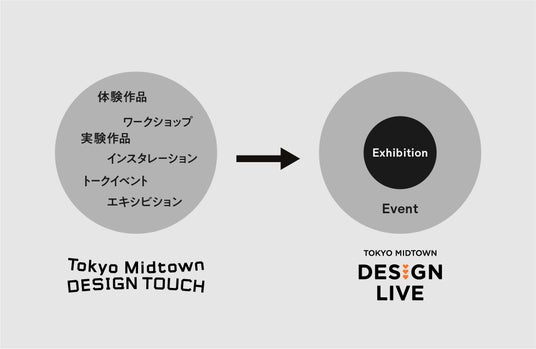 デザインタッチからデザインライブへ昨年までのTokyo Midtown DESIGN TOUCH は、芝生広場でのインスタレーションなど多彩な催しが行われ、幅広い客層の来場者でにぎわってきました。TOKYO MIDTOWN DESIGN LIVEでは全体の規模感はそのままに、本格的なデザインのエキシビションをメインコンテンツとして位置づけます。これは毎年のテーマに基づいて時代を担う多くのクリエイターが参加し、一般の来場者からプロフェッショナルまでを満足させる内容を目指すものです。さらに東京ミッドタウンの館内や屋外で開催する各イベントも、同様のテーマをふまえて充実させていきます。