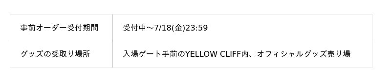 会場で販売予定のオフィシャルグッズを、指定の日時に会場で受け取る事ができる大好評の事前オーダーサービスを今年も実施します。