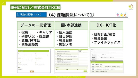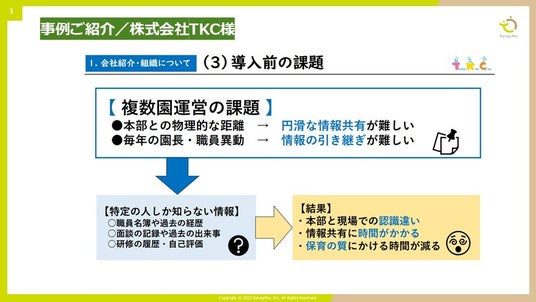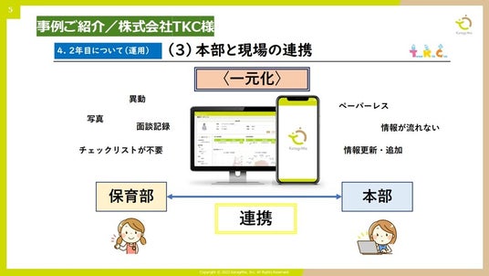 TKC様は17園の保育施設を運営する中で、本部と各園との物理的な距離や情報共有の属人化といった課題を抱えていましたが、「KatagrMa」の導入により、情報のデータ化・一元管理、複数システムとの連携による保育DXを推進。本部と現場の連携強化、職員育成の仕組み化、そして保育の質向上に繋がる成果を上げています。