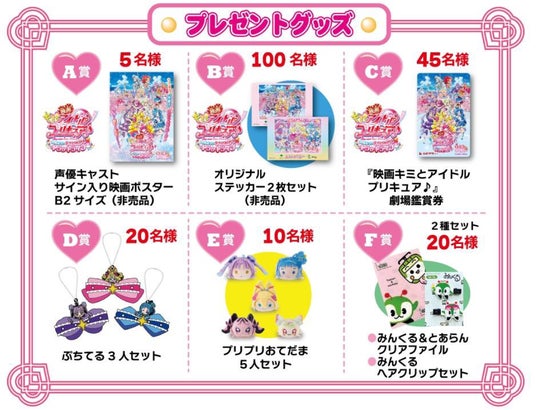 7月19日(土)から配布するリーフレットでスタンプラリーにチャレンジ。都02、都08及び上26系統の沿線施設に設置した5つの「みんくる」スタンプのうち4つ以上集めた方の中から抽選で、総勢200名様に声優キャストサイン入りポスター、『映画キミとアイドルプリキュア♪』劇場鑑賞券(9月12日(金)公開)、「キミとアイドルプリキュア♪」グッズやオリジナルステッカー、「みんくる」オリジナルグッズセットをプレゼントします。